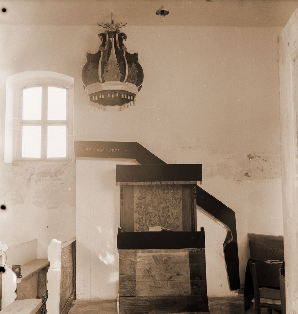 ![Az 1978-as felújításról szóló felirat a szószék hangvetőjén “Kijavítva és lefesttve: Anta József által ifj. […] János egyházi gondnok és Egyed Dániel unit. Lelkész idejében. 1978. Julius – Aug. 12. én”](/wp-content/uploads/2012/10/1351345194SzNMRo_147-300x168.jpg)