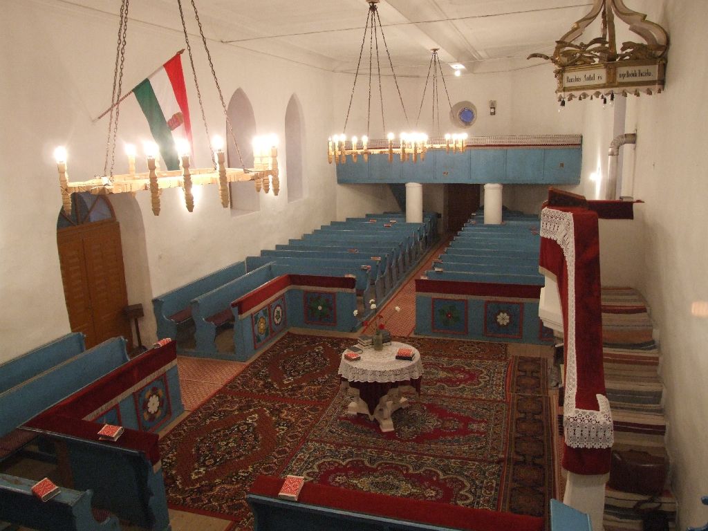 A fehér falú templombelsőre festett deszkamennyezet borul, alatta huszonhét, két oldalon elhelyezkedő pad sorakozik, valamennyi a templom nyugati végének közepén álló szószék és az úrasztala felé fordítva. Az épülettel egyidősnek látszó padok igényesen dolgozó asztalos művei. A katedra viszont egyszerű, téglaalapú, 1949-ben készült pulpitus, észak felőli följáratánál egy rövid mellvédes, födetlen papszékkel, másik oldalán a gondnokok hasonló rövid padjával.[2] Az úrasztala egy – templomban szokatlan – Thonet bútordarab, kerek fehér márványlapján fölirattal: