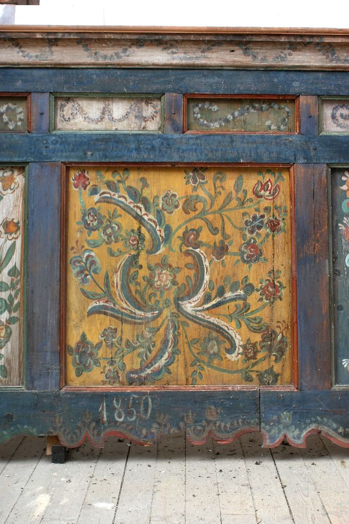 A szöveg alatt festett záró motívumként, szép, sokszínű, tulipános, indás virágtő nyújtózik. A feliratos táblát határoló tizenkét kazetta díszítése igényesebb a többinél: mindegyikbe egy-egy faragott, hatrészes dupla rozettát illesztettek, szirmaikat kék, vörös, fehér és sárga színekkel ékesítve.